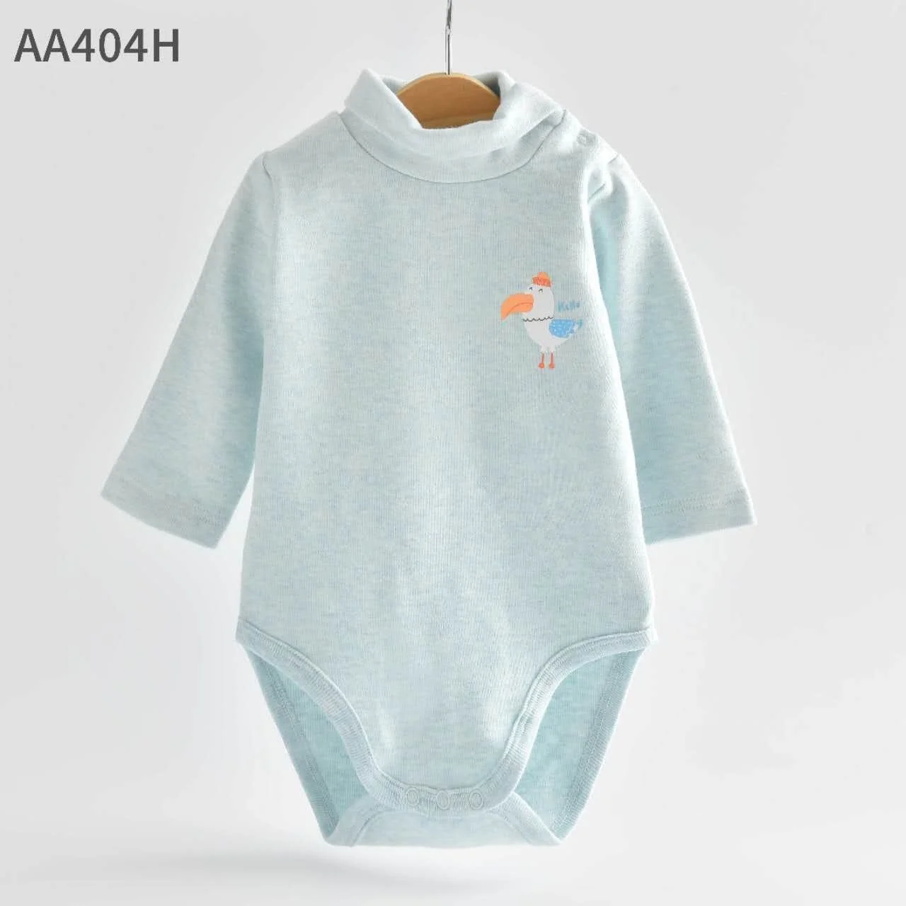 This baby bodysuit is made from thick, high-quality cotton fabric, designed to keep little ones warm and comfortable. It features a high neck (turtleneck) style for added coziness and two snap buttons on the shoulder for easy dressing. The bodysuit comes with long sleeves and snap closures at the bottom for quick diaper changes. A cute bird print with the word “Hello” adds a playful touch. Perfect for cooler weather, this bodysuit combines comfort, practicality, and style.