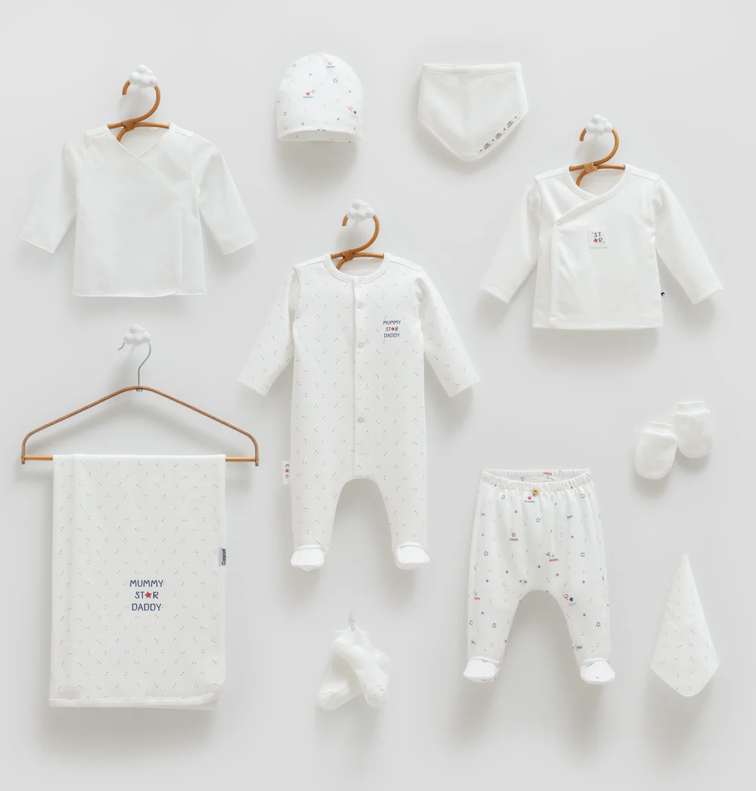 This is another 10-piece newborn hospital set, but with a sweet family-oriented theme. This set features the phrase “Mummy ★ Star ★ Daddy” and is decorated with a delicate, all-over pattern of tiny stars and dots in red and blue.