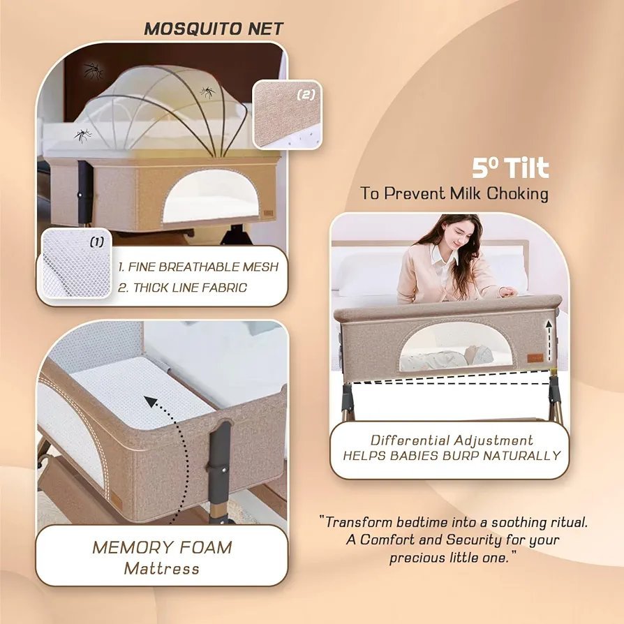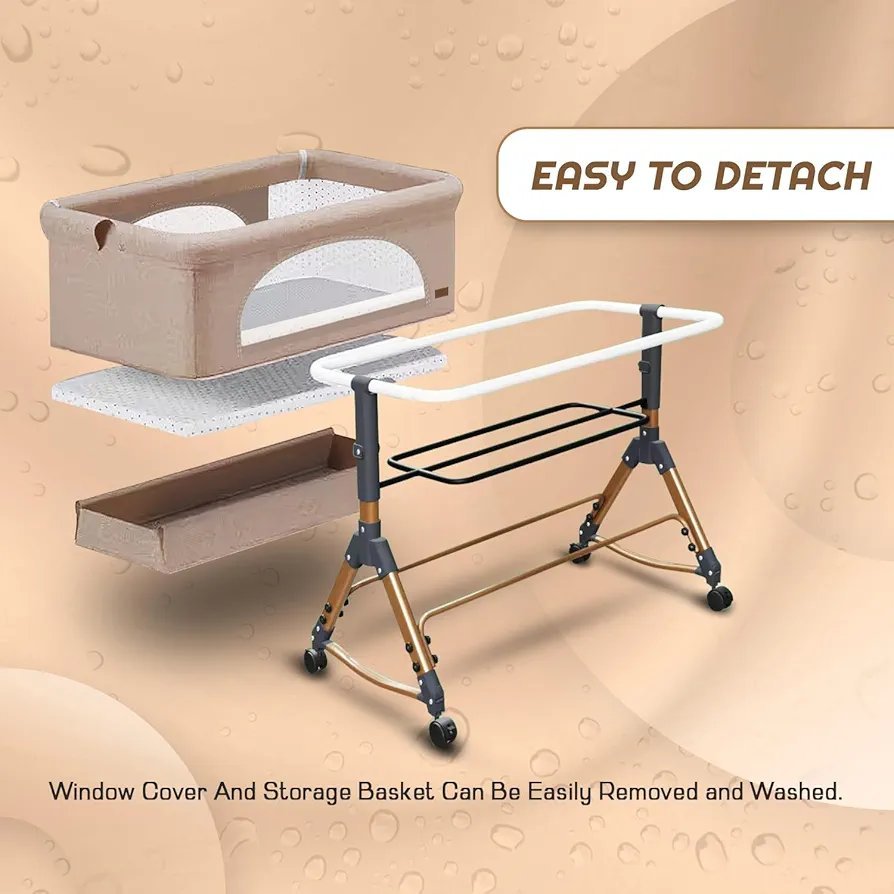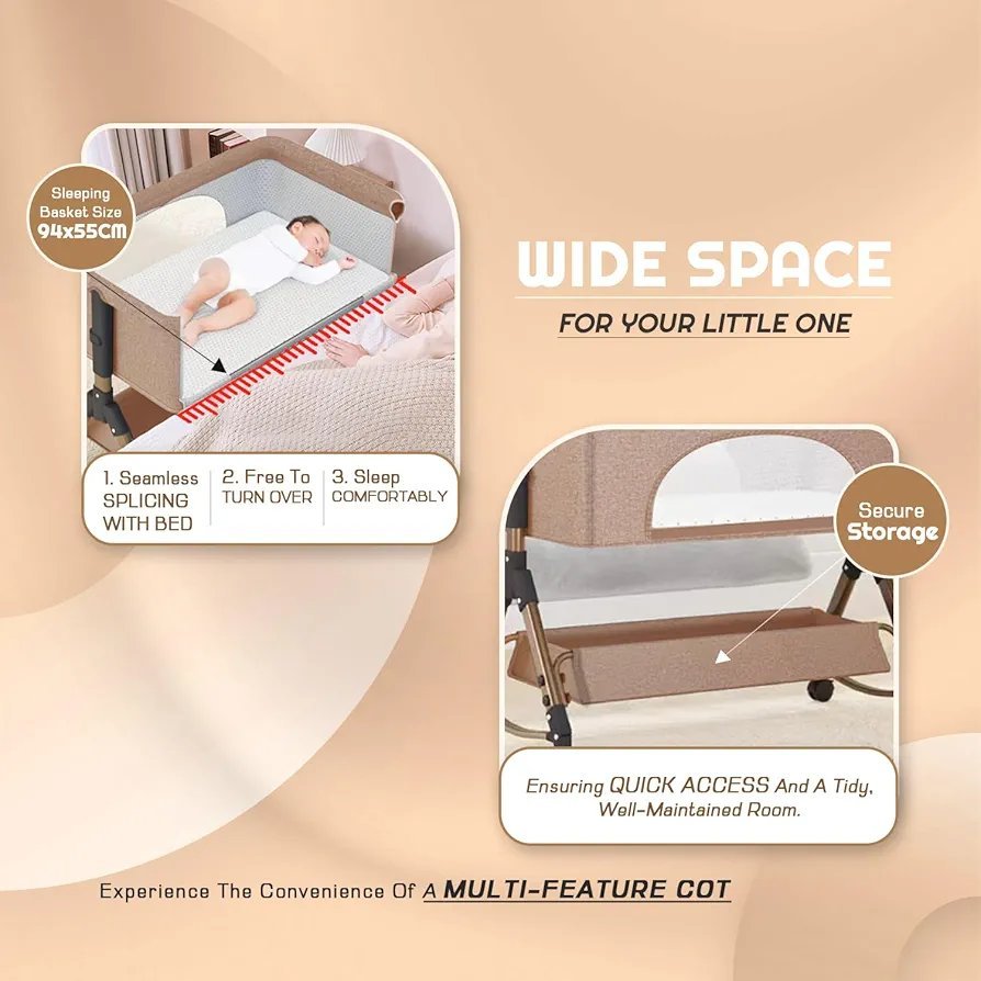 Safe Co-Sleeping: Features a seamless splicing design that allows the bassinet to sit flush against your bed, keeping your little one within arm’s reach for night-time feedings and comfort.