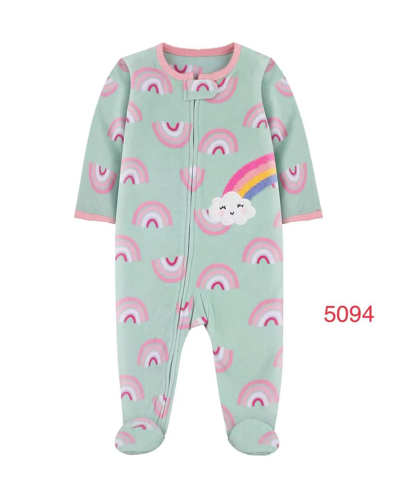 This is a bright and cheerful **fleece footed sleep & play** in a mint green color. It features a colorful rainbow and cloud appliqué on the chest, paired with a matching all-over rainbow print.