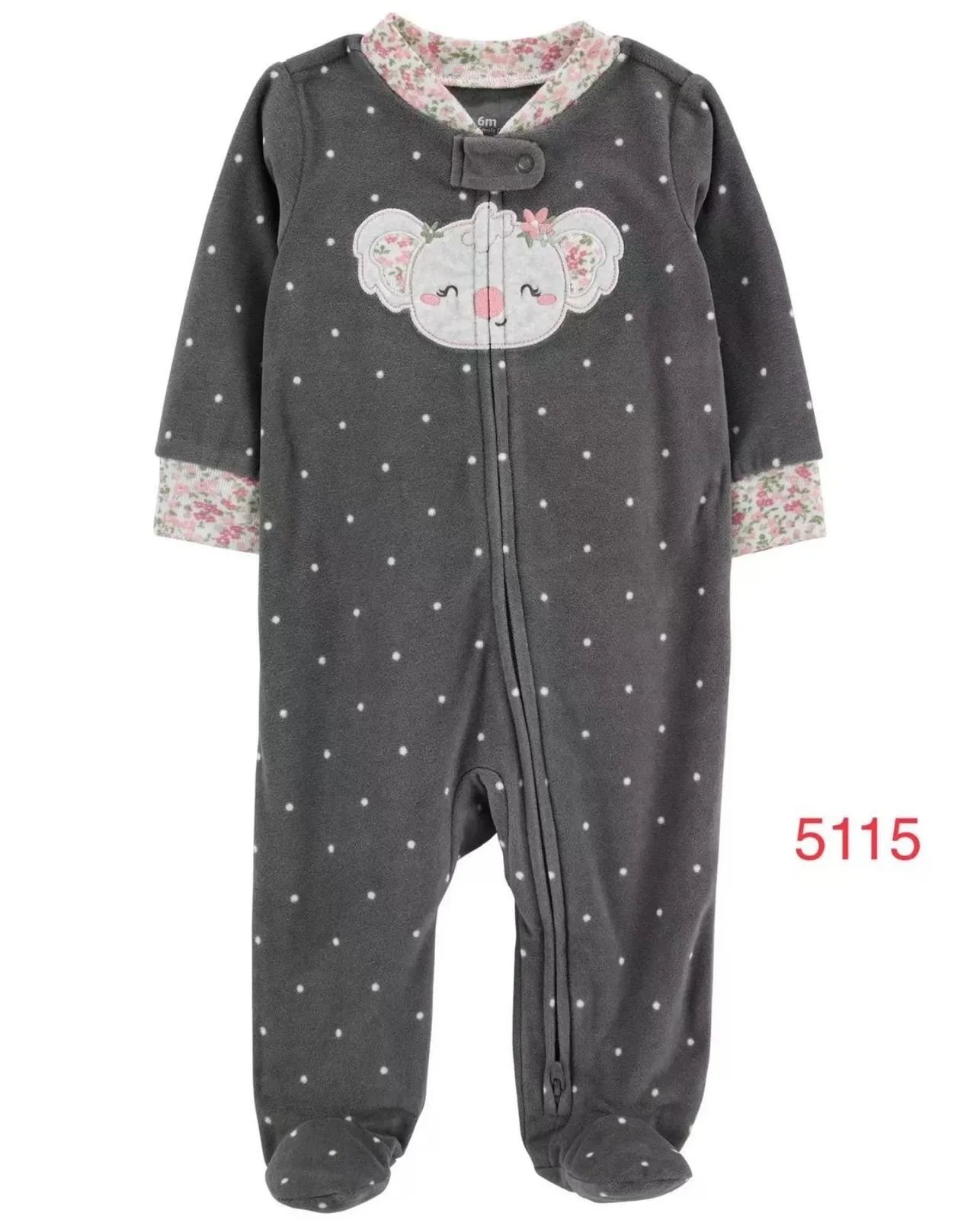 This is a sweet and cozy **fleece footed sleep & play** in charcoal grey, featuring a cute koala appliqué on the chest and delicate floral accents.