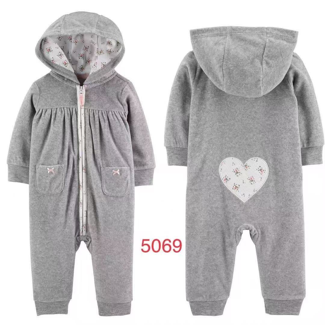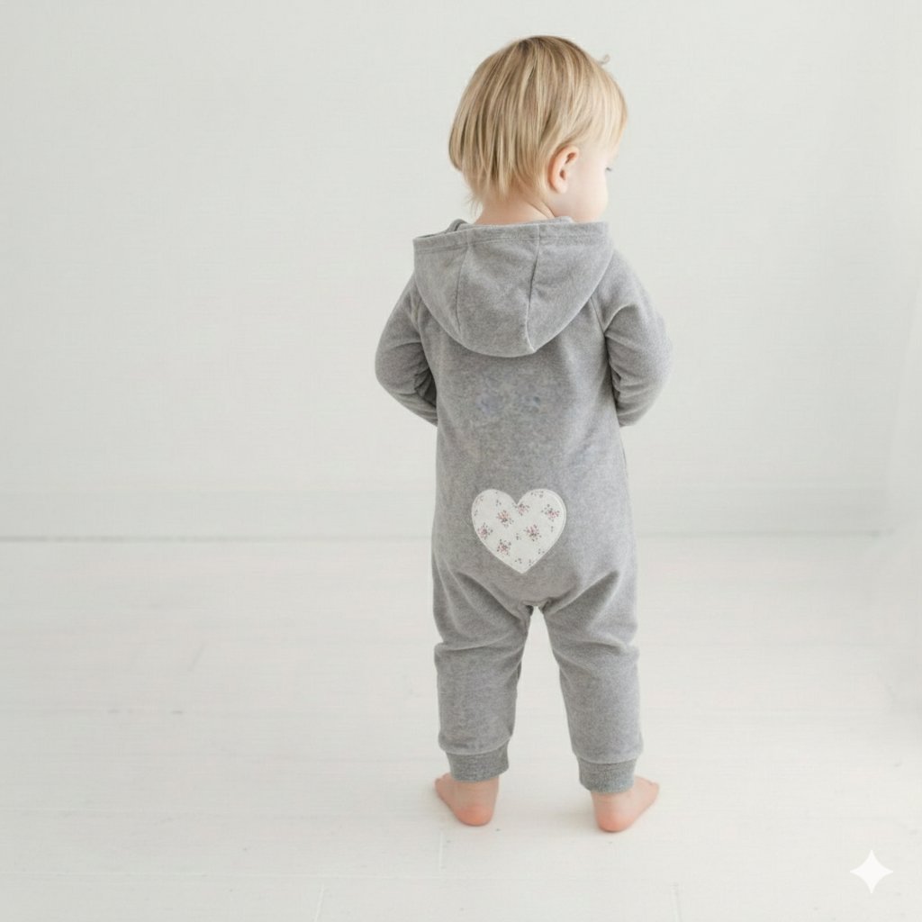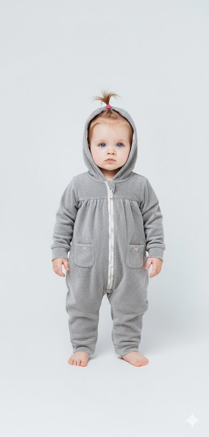 Keep your little one cozy in this soft grey fleece jumpsuit. It features delicate details like a hood lined with a dainty pink floral print and a matching heart-shaped appliqué on the back. Finished with sweet pink bows on the front pockets and a full-length zipper for easy dressing.