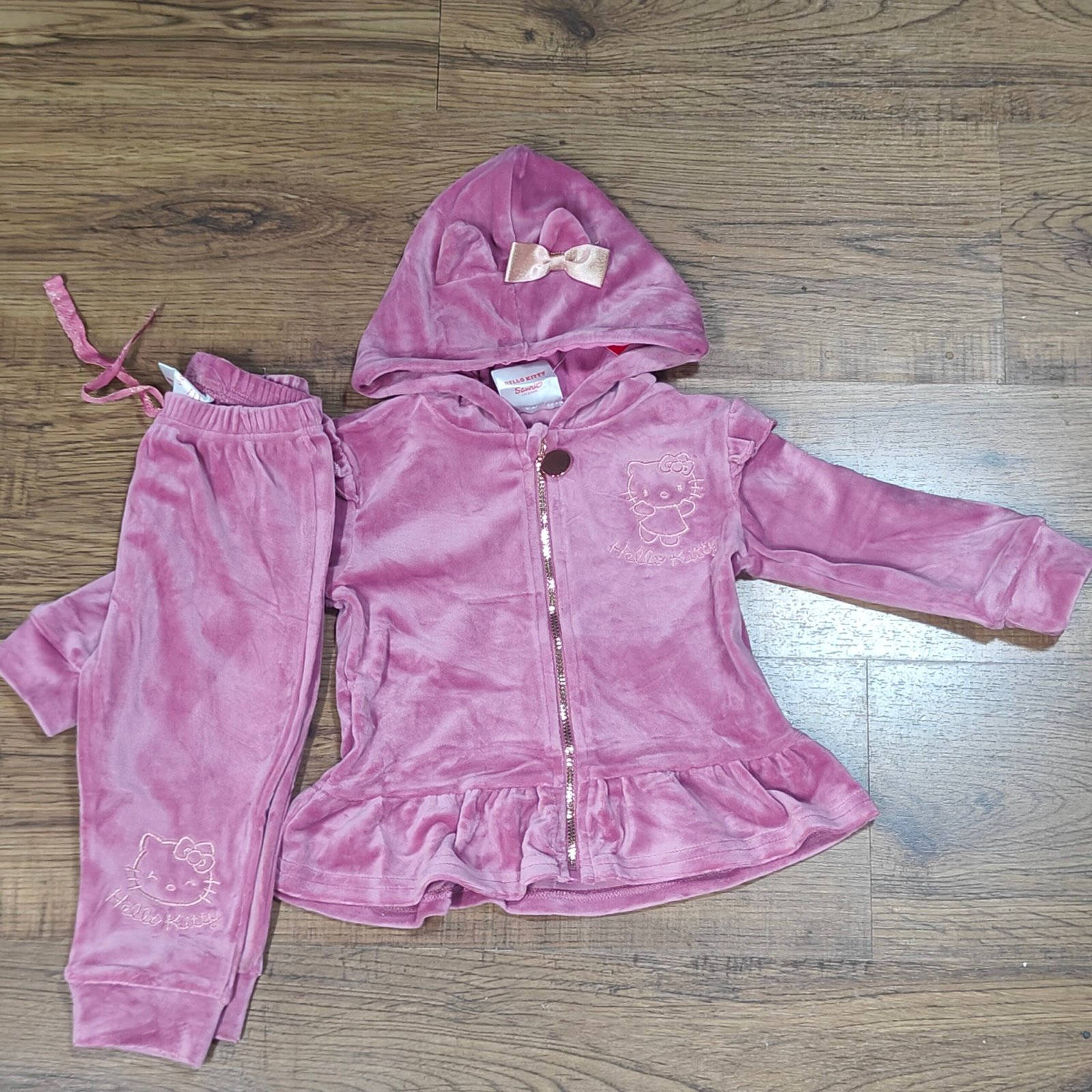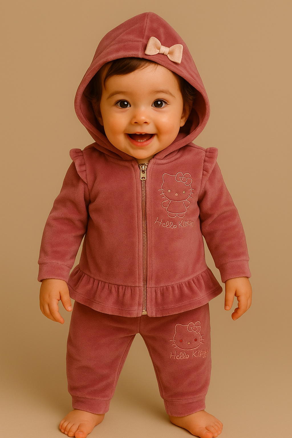The hooded top includes an adorable satin bow and embroidered Hello Kitty design on the chest, adding a sweet and playful touch. A ruffled hem gives it a girly flair, while the zip-up front ensures easy dressing. The matching pants come with elastic cuffs and a coordinating Hello Kitty embroidery on the leg for a perfectly balanced look.