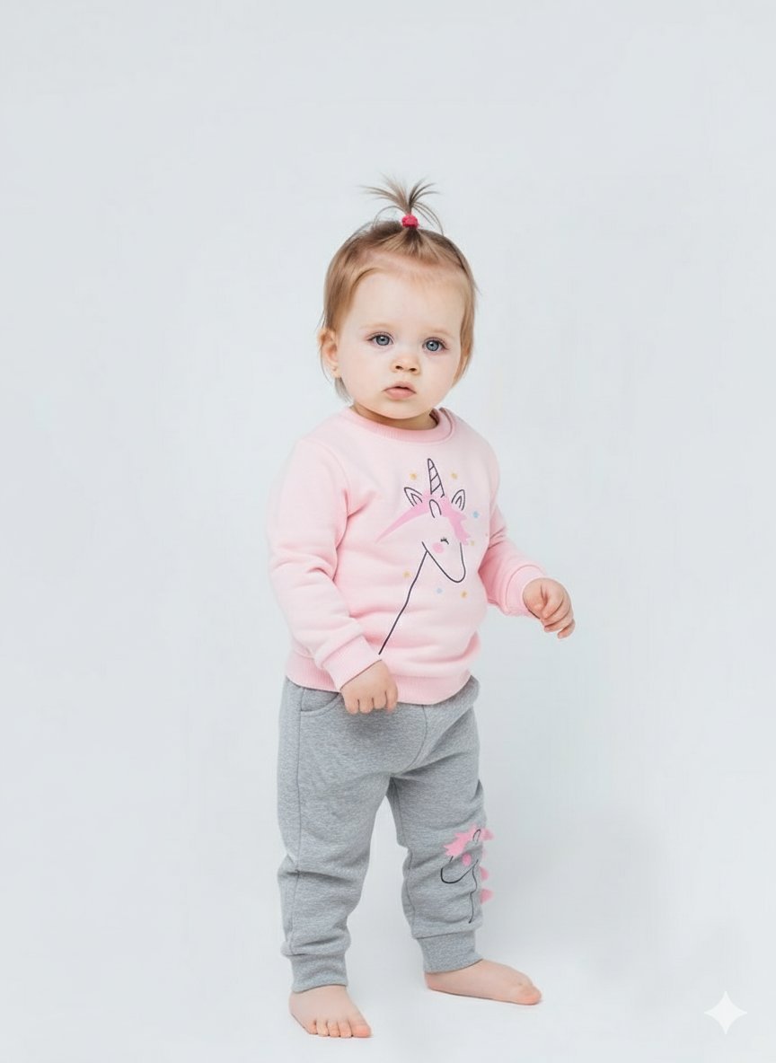 Top: The bright pink long-sleeved sweatshirt is adorned with a whimsical, stylized unicorn graphic. The unicorn features a sparkling horn, star details, and colorful accents. The top has a comfortable crew neck and ribbed cuffs.