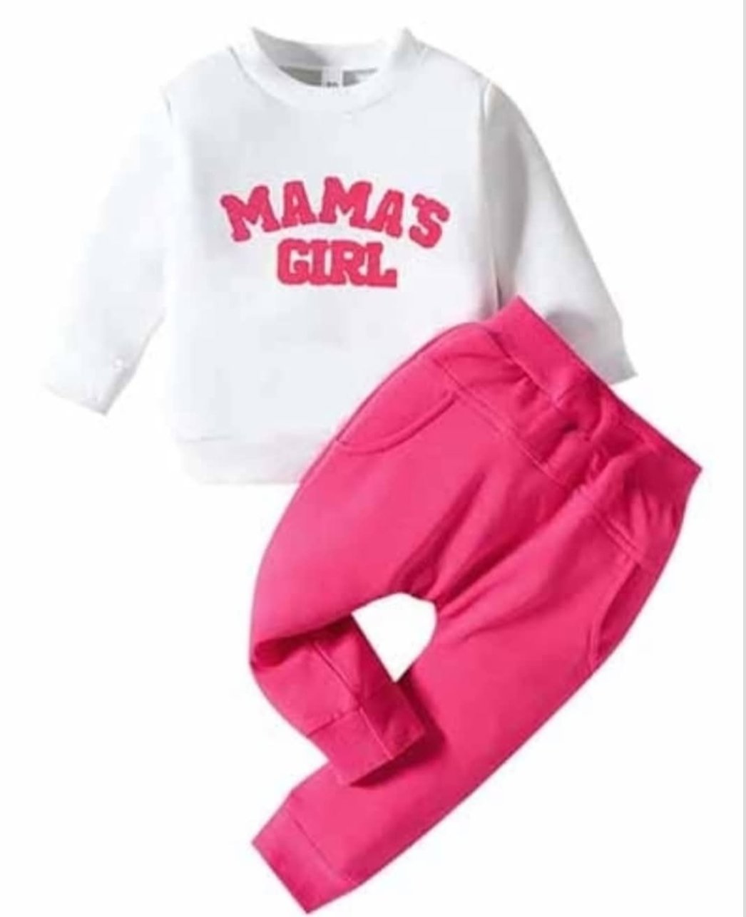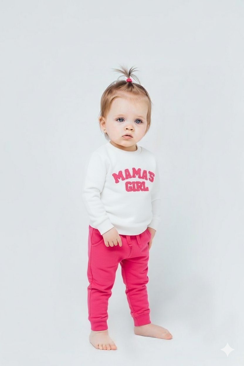 Top: The long-sleeved sweatshirt is a crisp white and features the bold, affectionate phrase “MAMA’S GIRL” printed in vibrant magenta/hot pink lettering. It has a classic crew neck and a relaxed, comfortable fit.