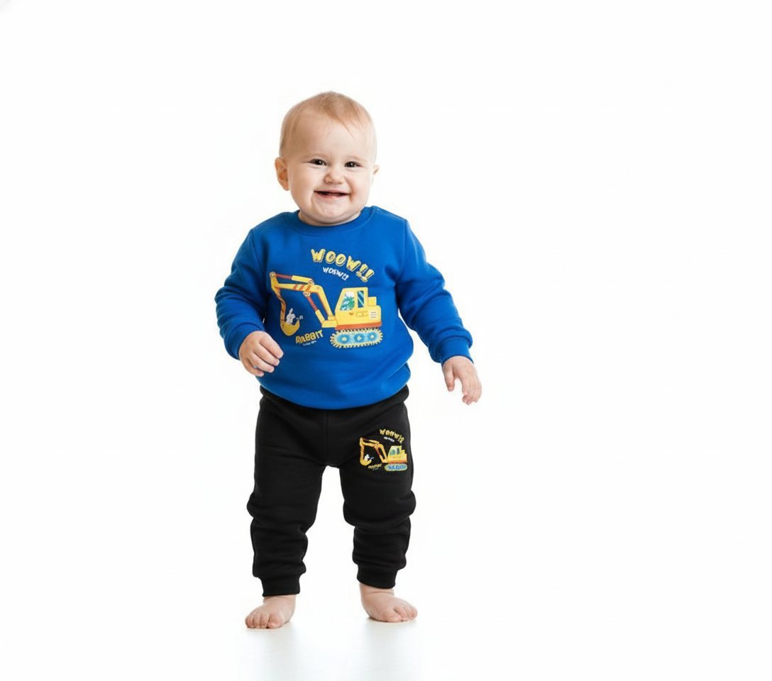 Top: The long-sleeved sweatshirt is a vibrant royal blue. It features a large, detailed graphic of a yellow excavator with the text “WOOW!! WORKS” and “RABBIT”. The bright colors stand out vividly against the blue background.