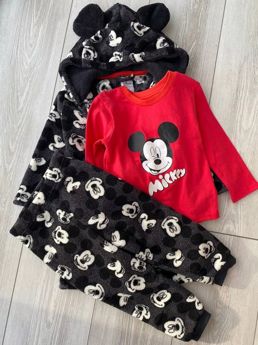 Pajamas: Includes a vibrant red long-sleeve top with a large winking Mickey Mouse graphic and a matching pair of patterned fleece bottoms with ribbed ankle cuffs.