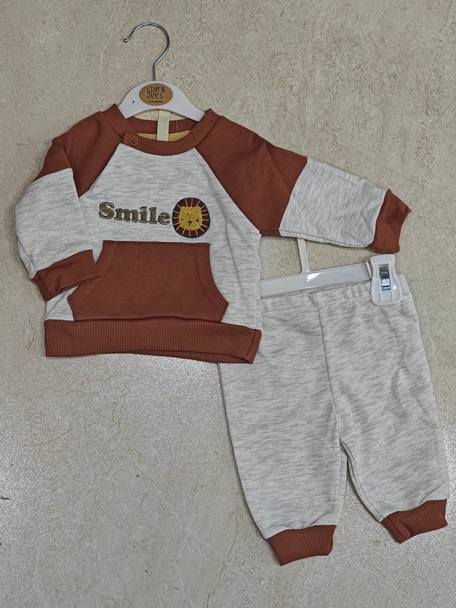 Top: Soft sweatshirt in a warm rust and light grey color combo, featuring an adorable embroidered lion face and the word “Smile” for a playful touch.